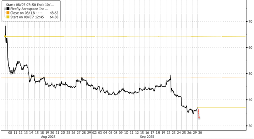 In New York, shares of Firefly fell as much as 13% in early cash trading. The stock, which began trading on Nasdaq in early August under the ticker “FLY,” has since tumbled 50% from its debut, according to Bloomberg data.