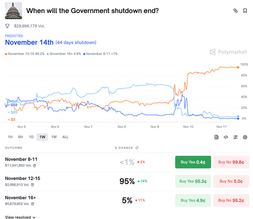 Polymarket odds now show a 95% probability that the government will reopen by Saturday, suggesting relief may be imminent.