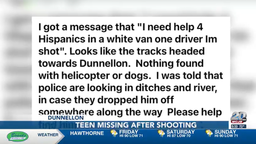 Another local outlet, WCJB, cited a Facebook post from Speight’s family that included a message from Caden: “I need help. Four Hispanics in a white van, one driver. I’m shot.”