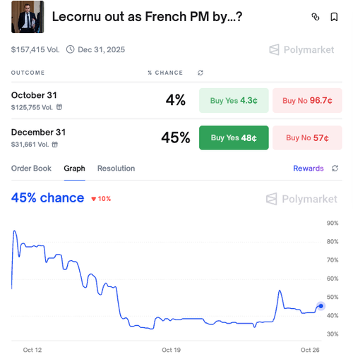 The latest data from the cryptocurrency-based prediction market Polymarket shows that Lecornu’s odds of being ousted are 4% between now and the end of October, but rise to 45% by year-end.