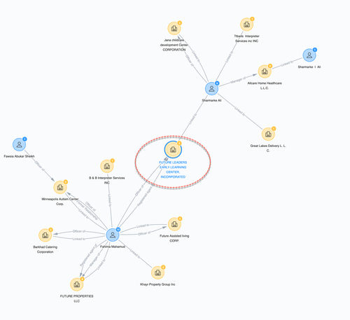 Diving into the corporate records of Future Leaders Early Learning Center reveals a familiar pattern. Fahima Mahamud is listed as an officer of the learning center and of multiple other companies, including assisted living and autism centers. The childcare center is also linked to Sharmarke Ali, who is connected to another childcare center as well as a home healthcare company.