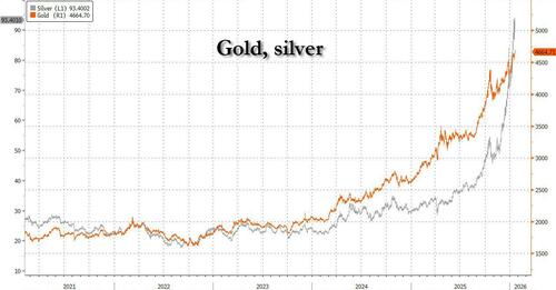 Stocks sold off and gold hit a new record as trade tensions between the US and Europe erupted over Trump’s push to take control of Greenland (which we learn today is due to Norway’s snub of Trump for the Nobel peace prize). While US cash markets are closed for the MLK holiday, S&P futures dropped 1.1% and Nasdaq futures tumbled 1.4%, while Europe’s Stoxx 600 was on track for its worst day in two months led by luxury stocks and German automakers as BMW dropped 3%. The dollar retreated 0.2%, while the Swiss franc outperformed. Gold topped $4,670 an ounce. US markets are shut today for a public holiday.