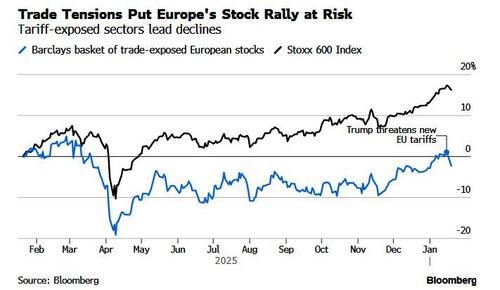 - Europe’s tariff-exposed sectors — including autos, drinks and shipping — are trading lower on Monday, after President Donald Trump announced on Saturday a new 10% levy on eight countries opposed to his plans to seize Greenland