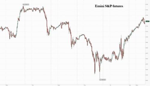Last week’s small market swoon is a distant memory with US equity futures up sharply on Monday, led by tech and small caps as the S&P looks to set a new ATH. As of 8:00am ET, S&P futures are up 0.5% (and off session highs) keeping the benchmark on track for its best September since at least 2013, even as the month is typically difficult for stocks. Mag7 / Semis are mostly higher premarket, and with Cyclicals leading Defensives after last week’s stumble, the AI Theme looks resurgent again, helping sending European stocks broadly green. Most Asian equities advance as Chinese tech stocks resume rally. Hang Seng climbs for the first time in three sessions. Gold hit yet another record, topping $3,820 and pushing the market value of US gold reserves above $1 trillion, with a US government shutdown looming in 48 hours, while the dollar tumbles as clock ticks toward US shutdown deadline on Tuesday midnight. The yen strengthens below 149-handle and euro gains 0.2%. Yuan strengthens on industrial profits jump and a solid PBOC fixing. Treasury 10-year yield eases three basis points to 4.15%. WTI crude futures are offered around $65.30 on OPEC+ output hike expectations; commodities are weaker ex-Precious and Coffee which continue their bull runs. This is a heavy data week complicated by a potential government shutdown which could see labor market data delayed. The Fedspeech calendar is heavy with 12x speakers this week
