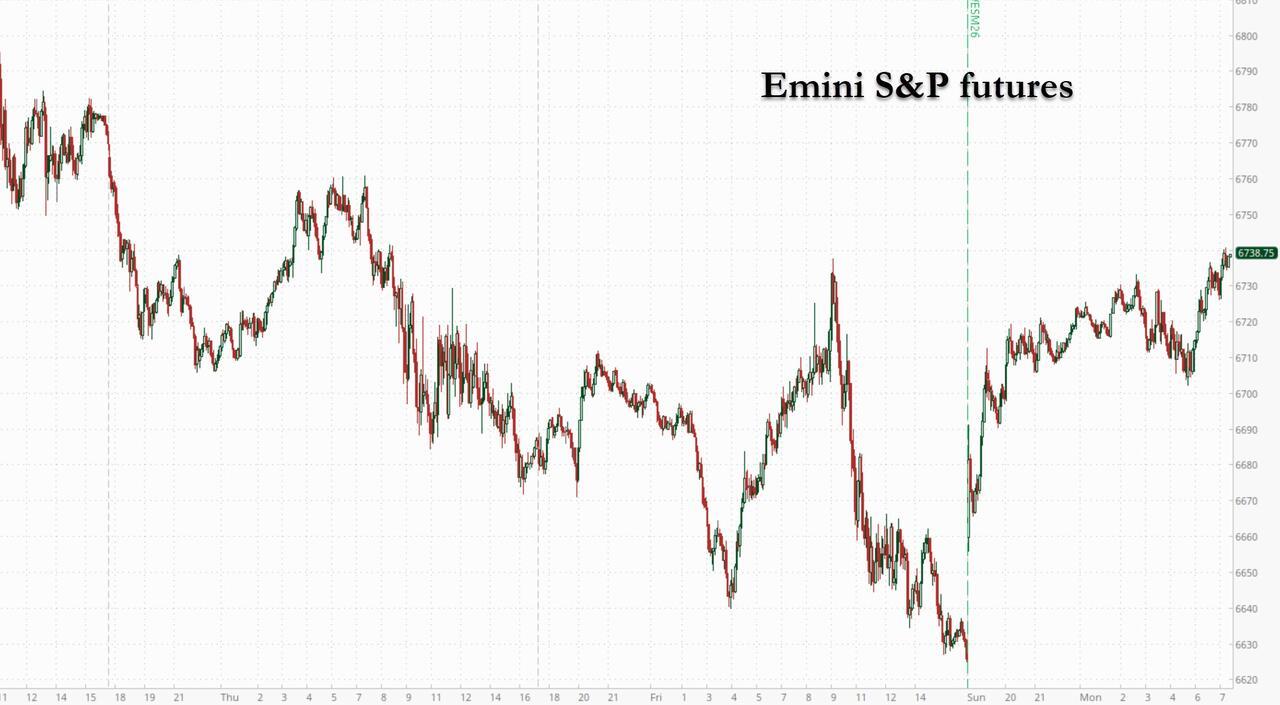 Stock futures are higher AS energy prices dip modestly even as the war in the Middle East enters a third week, with Trump’s endgame unclear amid requests for international help to reopen the SoH. As of 8:00am ET, S&P futures are up 0.8% and and Nasdaq futures gain 1.0% with all Mag 7 names higher in premarket trading led by Meta which is reportedly planning layoffs that could affect 20% or more of the company. The bounce in futs and the slide in oil coincided with comments from the Iranian Foreign Minister that the US has already learned a good lesson. However, he did also note that the nation is not requesting a ceasefire and has not messaged the US. Cyclicals outperform Defensives in what appears to be a relief rally. As JPM writes this morning, “it is unclear if futures are following the recent trend of a higher Monday into a sell off for the balance of the week, or if the market is pricing a pivot despite the likelihood that oil production curtailments will approximately double this week.” Bond yields are lower by 1-2bp as the curve bull steepens, and USD is lower. Commodities are weaker ex-Energy. Initially oil jumped at the start of futures trading on Sunday night following a second attack in three days on Fujairah, a vital port in the UAE that’s just outside the Strait of Hormuz, but has since turned red. And while shipping through the Strait has been all but halted since the war started, several Iranian tankers as well as a vessel controlled by have made the journey. Today’s macro data focus is on Industrial Production, home prices, and regional activity indicators. The Fed meeting (plus other major CBs) and PPI are the other major releases this week.