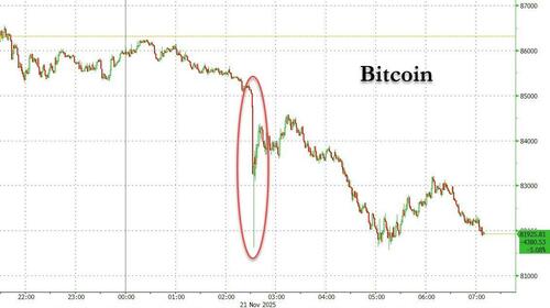 US stock futures struggled for direction after the S&P 500 sank to its lowest level since September amid a sustained retreat from the market’s riskier corners. Bitcoin fell below $82,000, after suffering a 3000 point flash crash just before the European open.
