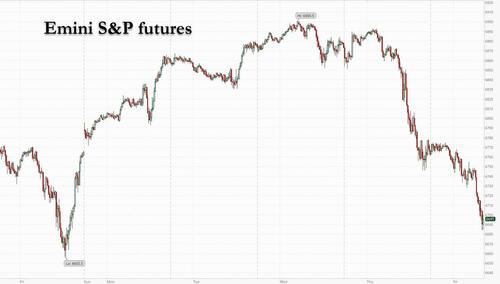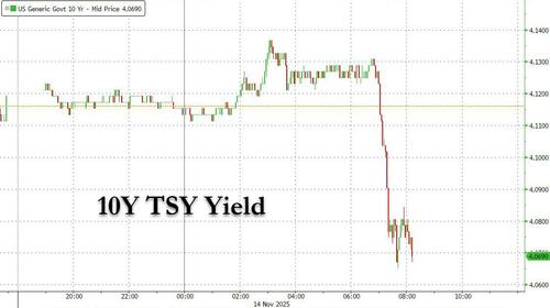 One doesn’t need to look at futures to see the signs of growing nervousness, with volatility in bond markets also on the rise. Minneapolis Fed president Neel Kashkari said Thursday he didn’t support the US central bank’s last interest-rate cut, though he’s still undecided on the best course of action for its December policy meeting. Markets are now pricing in less than a 50% chance of a cut next month, down from about 63% earlier this week and over 95% a month ago. Just after 7am ET, we saw a purchase of 135K 10Y futs which slammed yields 6bps lower in minutes.