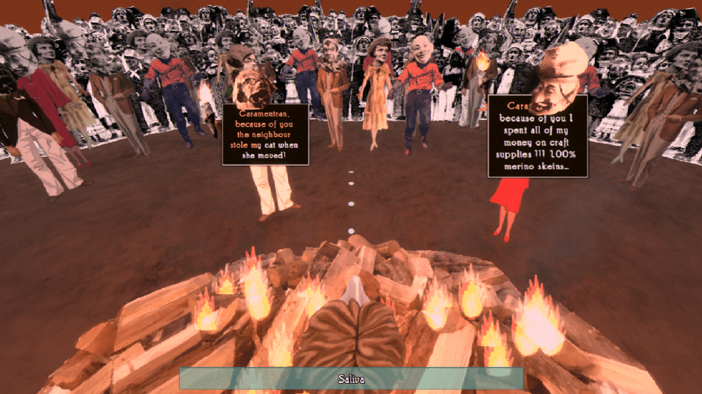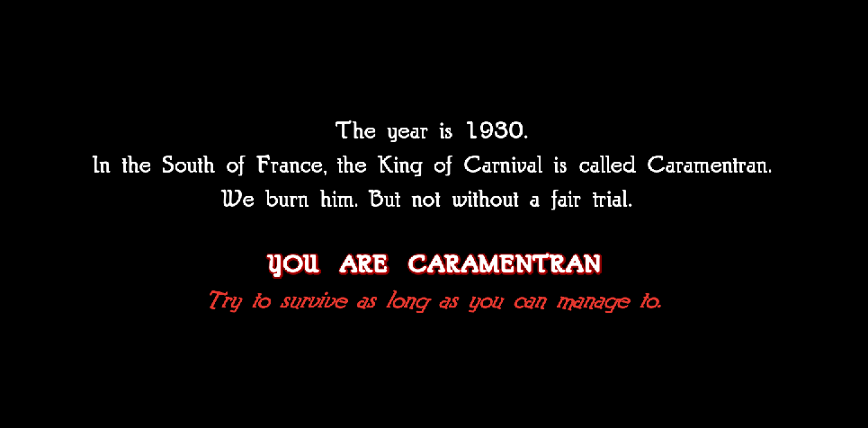 Sometimes, we get entries that were designed for more than one game jam, and this is one of them. In this case, the game was also created for the Themed Horror game jam in which one of the themes was “macabre carnival”. CARAMENTRAN delves specifically into a Provençal carnival tradition from France, in which the “King of Carnival” or Caramentran is put on trial for all the year’s ills then burned at the stake in punishment. As the player, you are Caramentran himself, trying to ward off accusations from the villagers while extinguishing the flames at your feet in a grimy, unsettling horror arcade game.