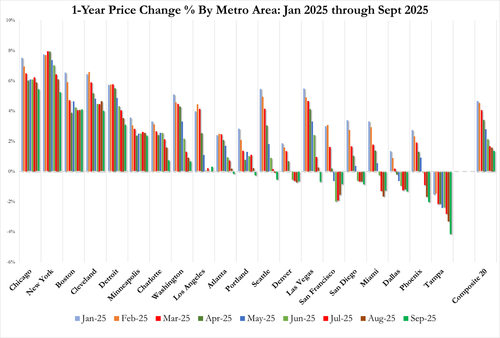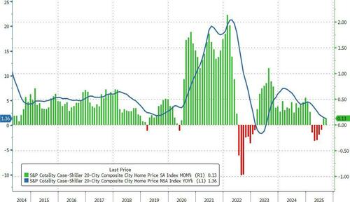US home prices in the 20 largest cities rose 0.13% MoM in September (very slightly better than the 0.1% rise expected) and up for the second month in a row (after falling for five straight months before). This MoM rise left the average priers up just 1.36% YoY – the lowest since July 2023…