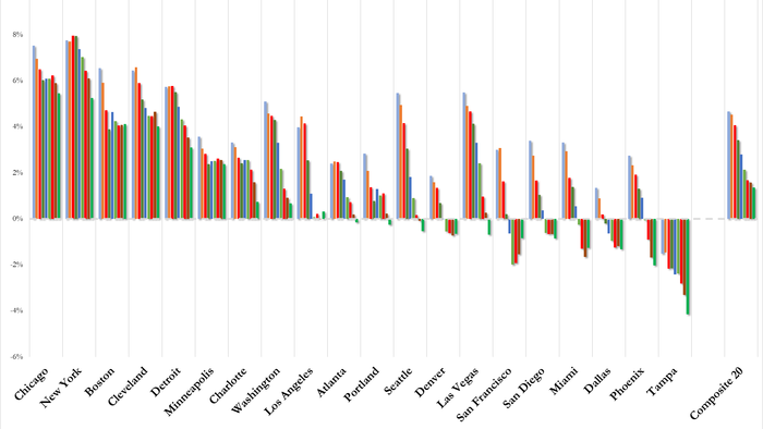 Chicago continues to lead with a 5.5% annual gain, followed by New York at 5.2% and Boston at 4.1%. These Northeastern and Midwestern metros have sustained momentum even as broader market conditions soften.