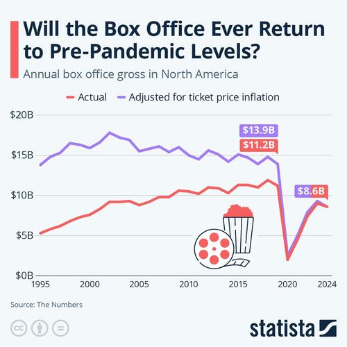 Profits never recovered after the pandemic shutdowns and this has been used for years by the progressive media as the excuse for Hollywood’s failures. However, by 2023 US markets were wide open along with most foreign markets and the covid scapegoat no longer exists. Adjusted for inflation, theatrical numbers were already in decline after 2015.