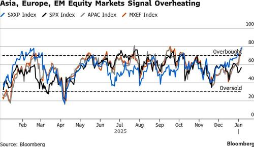 The New Year rally appears to be losing steam, despite renewed appetite for the AI trade and cyclicals over defensives. Some of the biggest action is in commodities, with an index of base metals surging to the highest since March 2022 and copper rising above $13,000 a ton for the first time, which needless to say, is and will be inflationary. At the same time, stocks in Asia surged, but as Bloomberg notes, are now getting dangerously overbought, along with markets in Europe and emerging markets. The S&P 500’s 14-day relative strength index also suggests that US stocks might have further room to run, in contrast with other regions that have surpassed levels typically seen as overbought. Macro and geopolitical risks are numerous, with Venezuela, Greenland and Taiwan all in the headlines today.