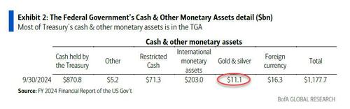 According to  none other than BofA’s heaviest of Fed plumbing hitters, former NY Fed staffer Mark Cabana, a gold re-marking could cause TGA to be paid down in ways that stoke macro activity, risk inflation, & add excess cash into the banking system (higher TGA would eventually move to higher Fed reserves or ON RRP balances). In essence, gold re-marking would ease both fiscal & monetary policy (all else equal).