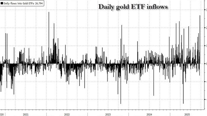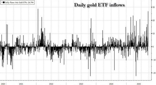Fast forward to today when that’s precisely what happened, and as Bloomberg writes this morning, gold has powered to a fresh record high “after flows into exchange-traded funds hit a three-year high, with investors betting that the Federal Reserve’s rate-cutting cycle has further to run.” It wasn’t just gold: silver also rose, with year-to-date gains topping 50%.