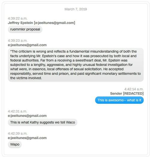 She also insists that she never represented Epstein or advocated on her behalf, despite Epstein texting an unknown individual with “what Kathy suggests we tell Waco” (later corrected to WaPo, as in the Washington Post).