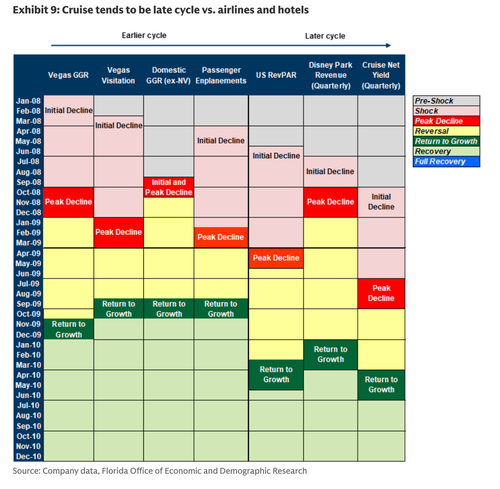 Buried in the middle of Dove’s note on the cruise industry is an infographic showing that the downturn in the cruise industry tends to be late-cycle, whereas pullbacks in gambling, airlines, and hotels typically materialize much earlier – and right before the cycle begins to turn down.
