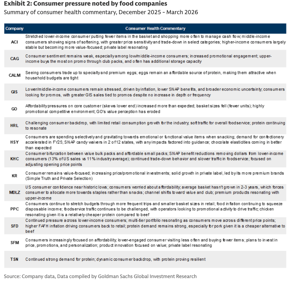 The latest read on the American consumer comes from Goldman analysts led by Leah Jordan, who compiled the most important commentary from food companies on consumer behavior trends in the fourth quarter. It’s worth noting, however, that this snapshot predates the energy shock triggered by the U.S.-Iran conflict.
