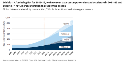A team of Goldman analysts led by Brian Singer and Carly Davenport told clients that global data center power demand is set to jump 175% from 2023 levels by 2030. In other words, this increase is equivalent to adding a top 10 electricity-consuming nation to the global grid. The revision, up from a prior estimate of 165%, reflects stronger-than-expected AI server shipments, larger data center capacity buildouts, and more bullish outlooks on the digital economy.
