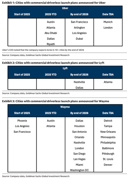 Specifically on the competitive landscape, we highlight several planned driverless deployments for Uber (covered by Eric Sheridan), Lyft (covered by Eric Sheridan), and Waymo robotaxis based on company announcements in the US and internationally (ex China) in Exhibits 1–3. Note that some of these overlap (e.g. in cities where Waymo and Uber partner), and we didn’t include cities with testing/data collection that have a less clear commercial objective (e.g. NYC, where state law does not currently allow for commercial AV operations).