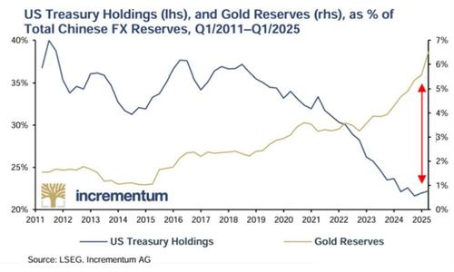 Japan has been dumping USTs to support its own broken credit markets and Yen, and China, well… it has been walking away from USTs (in favor of gold) in a staggering manner. Its FX reserves were once 40% USTs; by 2025, that figure had fallen to less than 1%: