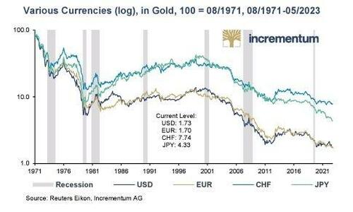 Since 1971, when the US insulted the world and its Constitution by taking away a gold standard, all the major currencies have lost more than 95% of their purchasing power when measured against gold.