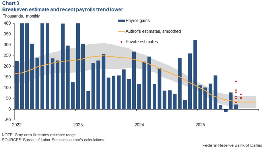 A new, high-frequency estimate of break-even employment shows a dramatic reversal in immigration flows, combined with cyclical shifts in labor force participation, has caused the monthly break-even requirement to collapse from a peak of approximately 250,000 in 2023 to about 30,000 in mid-2025.
