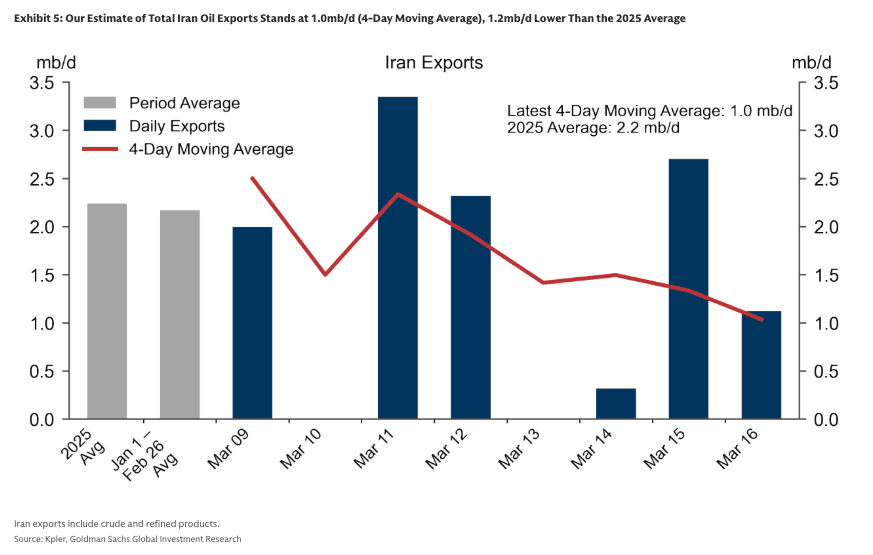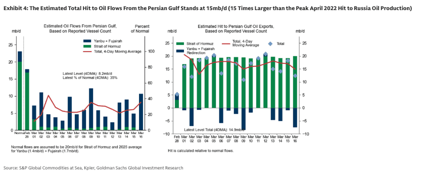 The estimated total hit to oil flows from the Persian Gulf stands at 15 mb/d, 15 times larger than the peak April 2022 hit to Russian oil production.