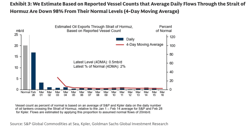 Goldman analysts, led by Yulia Zhestkova Grigsby, showed clients on Tuesday that shipping traffic through Hormuz remains down 98% from normal levels (4-day moving average).