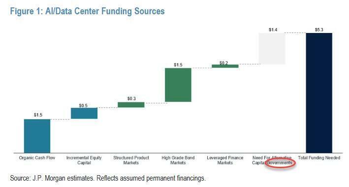 What fewer people know is that this money won’t be enough. According to an analysis by JPMorgan, it will take no less than $5 trillion to fund the AI cycle, and even with the massive capex – and debt outlays – the US government will still be on the hook for over a trillion to close the funding gap.