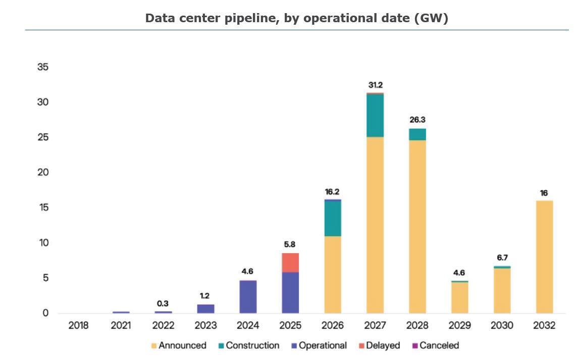 “We expect 30-50% of 2026 projects to be delayed, driven by power constraints (25% of projects have not disclosed powering strategies), increasingly effective community opposition, and potential grid equipment shortages. 11GW of 2026 capacity remains in the announced stage with no signs of construction, despite typical build times of 12 to 18 months. Itʼs still possible for this capacity to come online, but it would need to dramatically accelerate.”