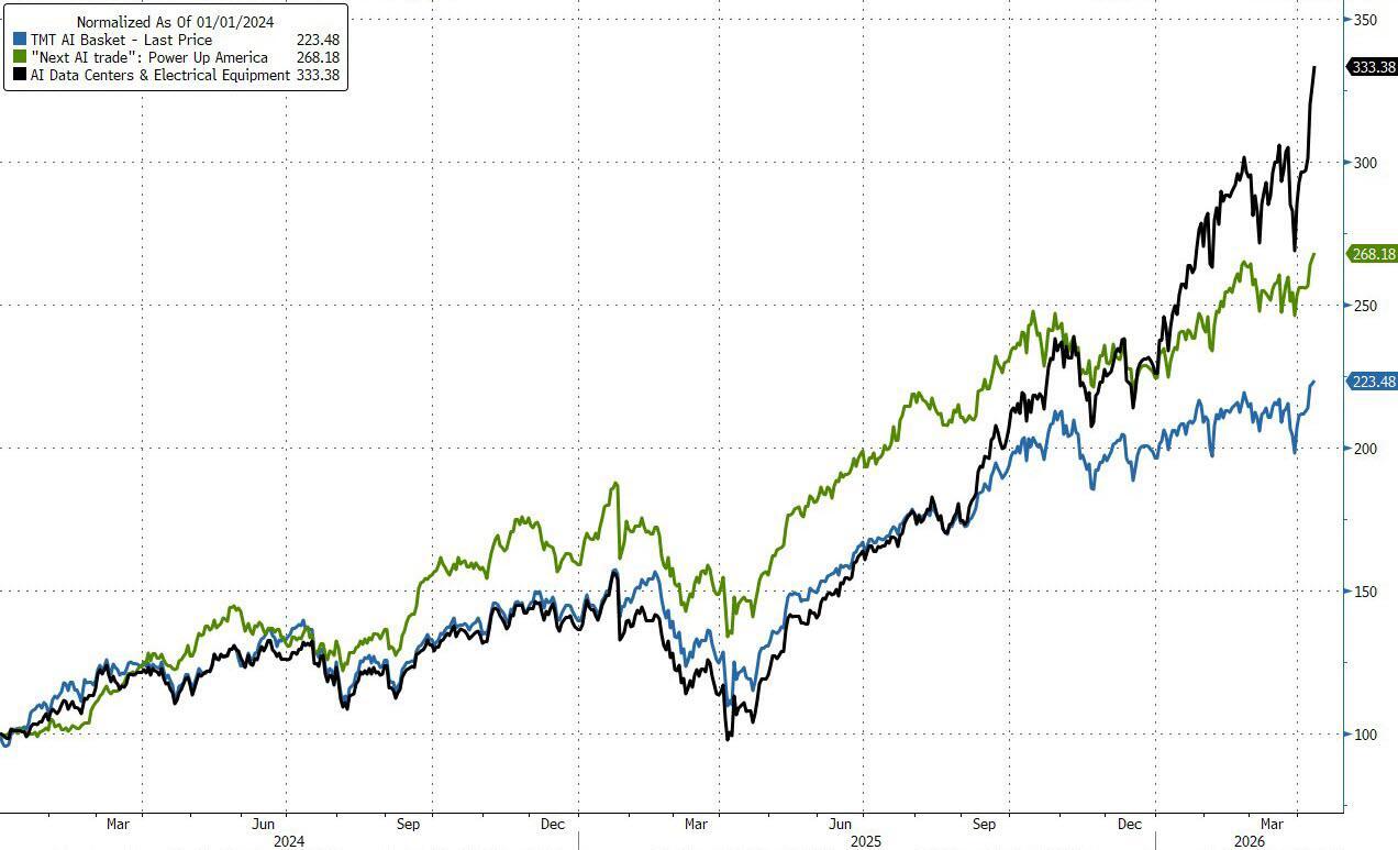 Yet as one can see in the chart below, after outperforming the AI Data center and the TMT AI baskets in 2024 and much of 2025, the Power Up America trade has taken a back seat as some investors have started to express doubt that the US would ever be able to “grow” into its massive AI computing needs… with dire consequences for record AI capex budgets, which however the market has yet to grasp.