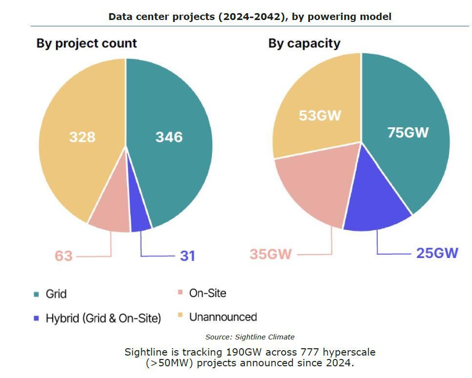 “On-site and hybrid power punch above their weight when measured by capacity. Grid-connected projects still lead at 40% of total capacity, but on-site generation and hybrid approaches together account for close to half of announced capacity, far exceeding their share by project count. A small number of gigascale, grid independent campuses account for this capacity, including New Era Energy & Digitalʼs 7GW project in Lea County, Homer Cityʼs 4.5 GW coal-to-gas redevelopment in Pennsylvania, and Crusoeʼs 1.8GW natural gas and renewables project in Cheyenne, Wyoming. These projects are large enough to require their own generation plant, and have the capital to fund it. Waiting for the grid to supply this level of capacity could take a decade.”