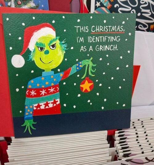The Dr. Seuss-themed card ironically features the Grinch character with the caption: “This Christmas, I’m identifying as a Grinch.”