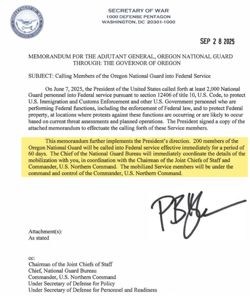 Hegseth wrote in a memo, “This memorandum further implements the President’s directive. 200 members of the Oregon National Guard will be called into Federal service immediately as part of the previously authorized call.”