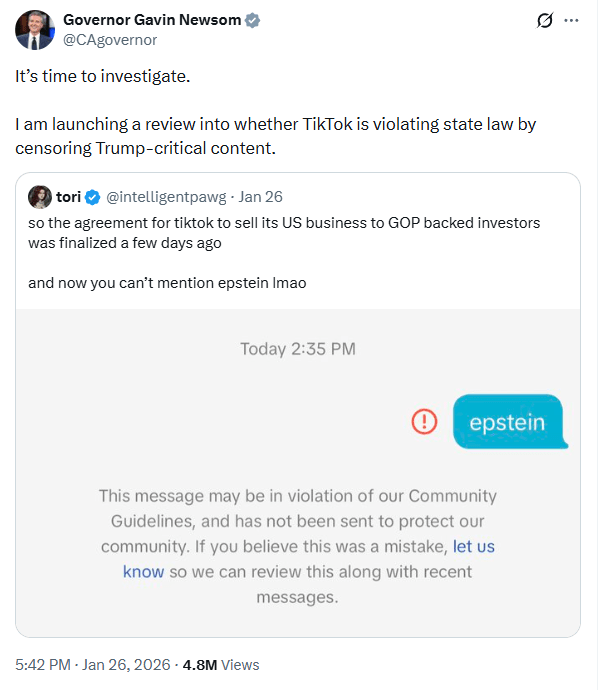 Hey Gavin Newsom! Investigating TikTok’s Moderation Is Just As Unconstitutional As When Texas & Florida Tried It