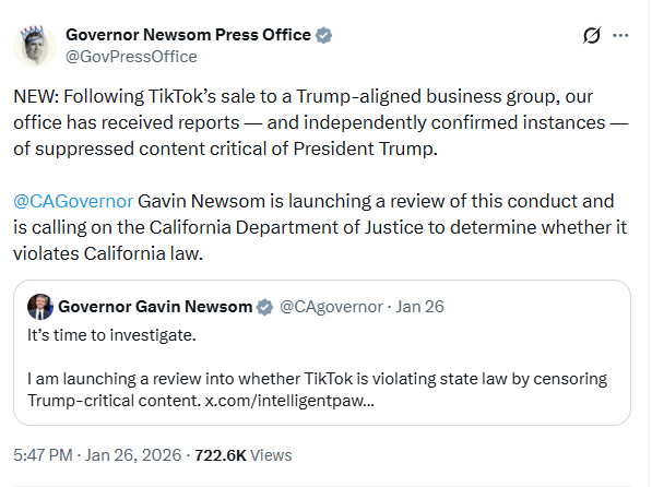 Here’s Newsom, announcing that he’s launching a review of TikTok’s content moderation practices: