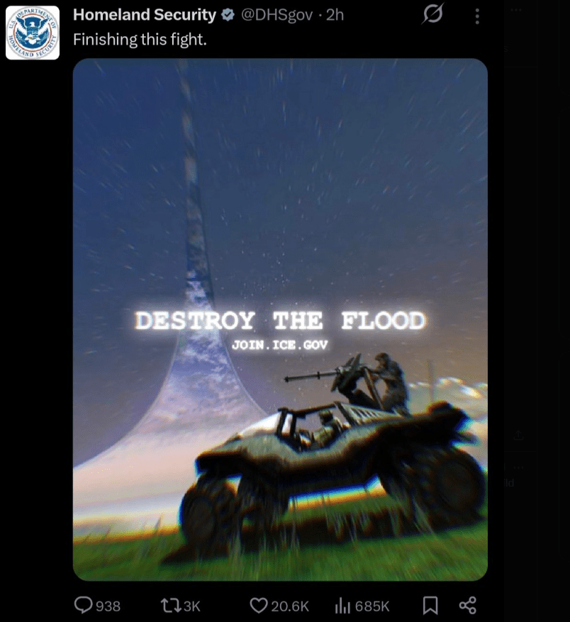 This was followed by another post by the official DHS account on X, which showed a screenshot from Halo along with the message “destroy the Flood – join ICE”.