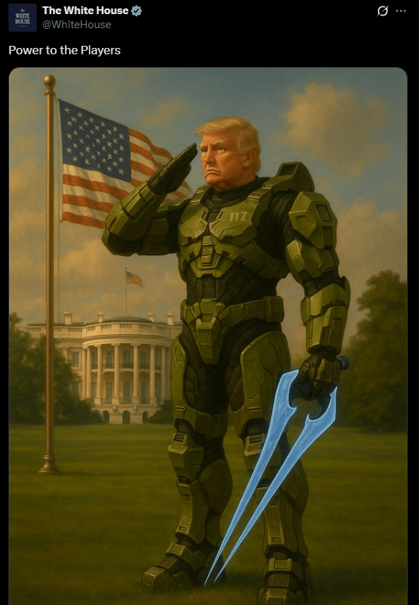 Earlier this week the White House posted an AI-generated image on X featuring President Donald Trump dressed as Master Chief from the Halo series, saluting a US flag (with missing stars) and holding a Covenant energy sword.