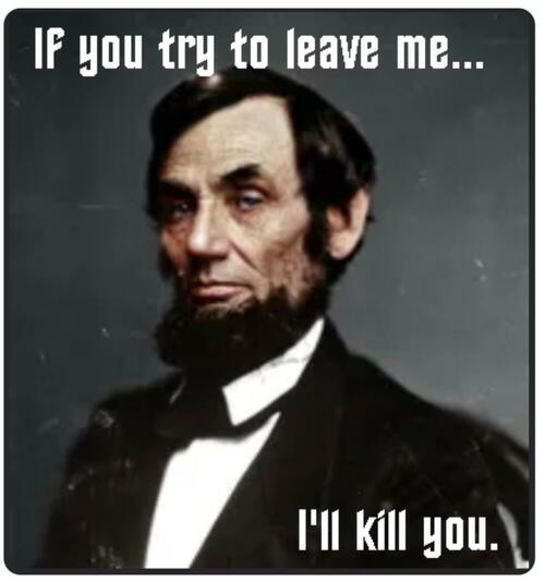 Wait. That is not actually correct. What happened in 1861 – and what may happen again – is that one side of the “union” refused to allow the dissolution. How bizarre! Everyone – almost everyone – would regard it (correctly) as criminal and even psychotic to force someone to remain in a marriage they wanted out of. The reasons why are beside the point. Marriage – any such commitment – ought to be done voluntarily and for love. Using force to maintain the relationship is the antithesis of loving someone because it is the relationship of owner and slave.