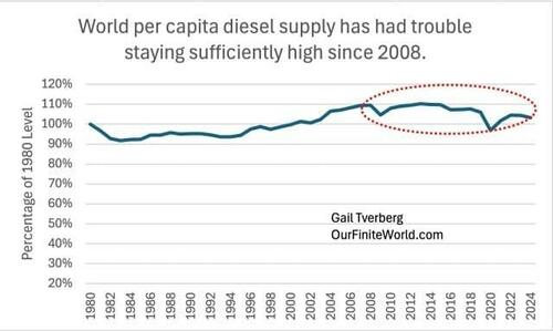 Figure 4. Chart showing the level of per-capita diesel consumption, relative to the per-capita consumption in 1980. Amounts are based on Diesel/Gasoil amounts shown in the “Oil-Regional Consumption” tab of the 2025 Statistical Review of World Energy, published by the Energy Institute.