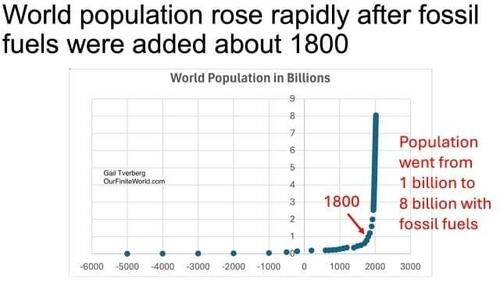 World population has exploded since fossil fuel consumption became abundant. This has allowed more food to be grown, inexpensive transportation of goods and people, and the development of antibiotics and other drugs.