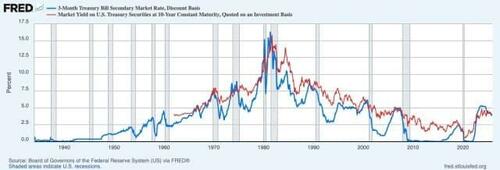 Figure 3. Interest rates on 10-year Treasuries (red) and on 3-month Treasuries (blue), based on data of the Federal Reserve of St. Louis.