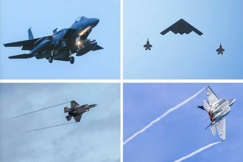 With missiles outbound, hundreds of Air Force F-15s, F-16s, and stealth F-22 Raptors merged with carrier-launched F/A-18 Hornets, stealth F-35s, and EA-18G electronic warfare jets in the massive aerial attack against Iranian air defenses and missile-launch sites.