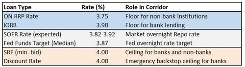 The Fed’s tools create a corridor, or floors and ceilings for overnight rates, allowing the Fed to control overnight borrowing rates. The table below shows what the corridor looks like assuming today’s Fed Funds target range of 3.75% to 4.00%.