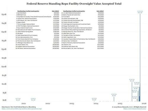 The graph below, courtesy of Bianco Research, shows that the Standing Repo Facility has been used somewhat frequently over the last two months. As we wrote, this is a ceiling of sorts and should be used only when the SOFR market is not functioning properly.
