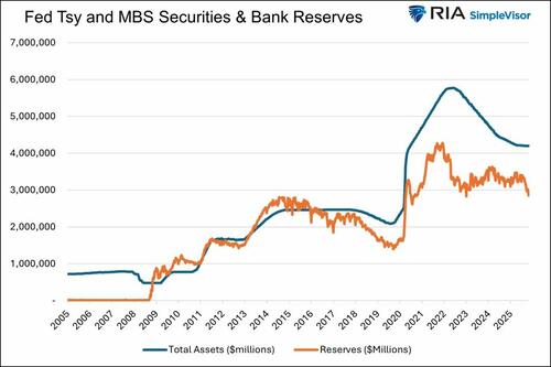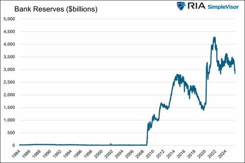 The graph below shows that bank reserves are approaching five-year lows. As a result, and unsurprisingly, the Fed has ended QT, which reduces reserves, and has begun hinting at QE.