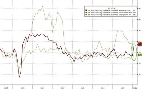 ISM’s Manufacturing was expected to rise from 47.9 to 48.5 in January but instead it soared to 52.6 – its highest since Aug 2022. This is the first print above 50 since January 2025.
