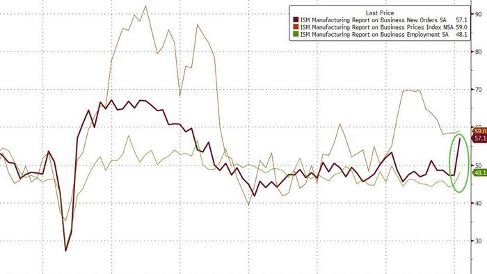 This was the biggest MoM surge in the ISM print since April 2020 (COVID rebound), led by a huge surge in new orders and rise in employment (highest in a year) and prices (though elevated) are stable…