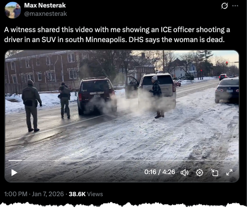Video of the deadly shooting has surfaced on X, showing an ICE agent asking the woman, who was blocking the street with an SUV, to step out of the vehicle. She did not comply and instead accelerated toward another agent, at which point the agent fired multiple rounds into the vehicle, striking the woman, who died moments later.
