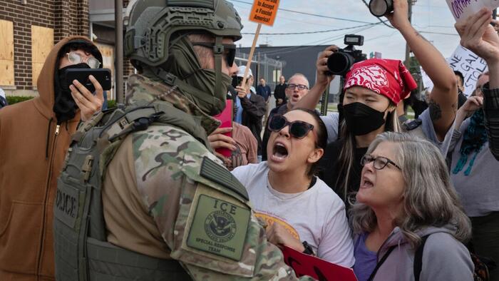 Protesters confront federal police during a demonstration outside an immigration processing center in Broadview, Ill., on Sept. 12, 2025. Scott Olson/Getty Images